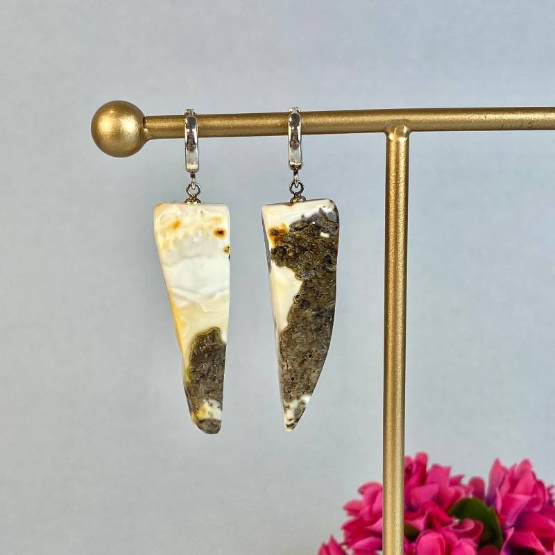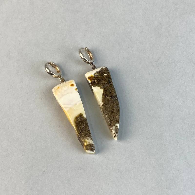 Dailūs pailgų formų margo gintaro auskarai. Šie gintariniai auskarai išskirtinai sukurti stilingai ir madingai moteriai.