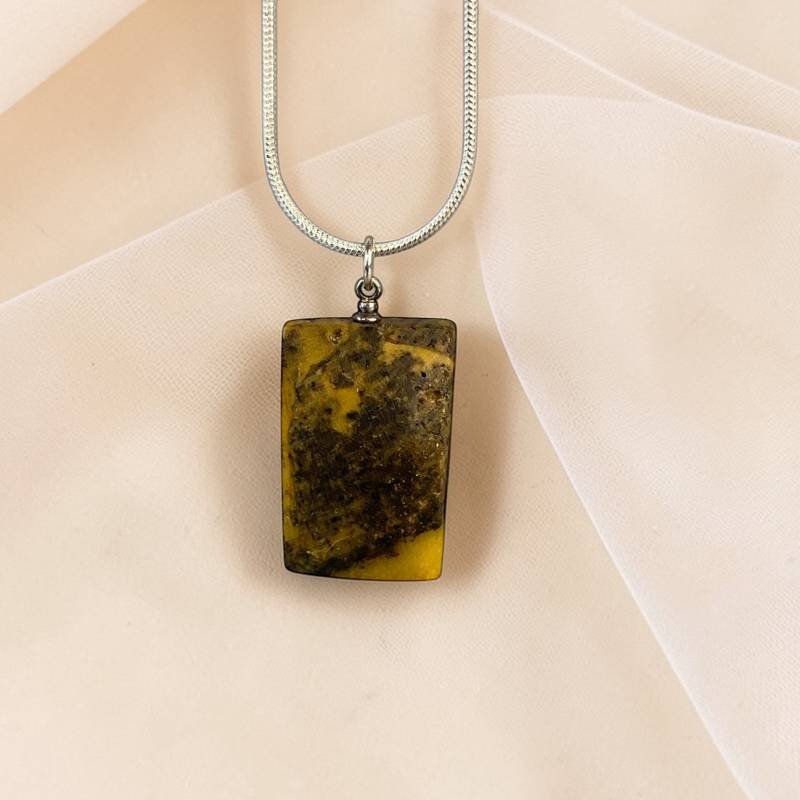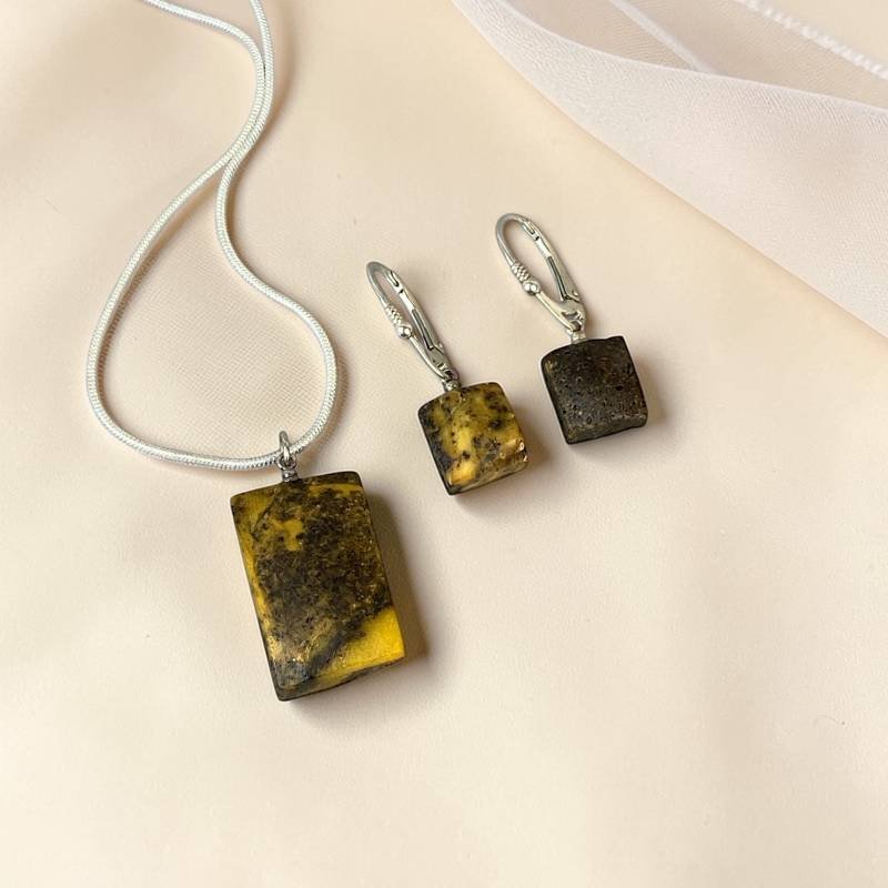 Elegantiškas ir stilingas matinio samaninio gintaro auskarų ir pakabuko rinkinys. Šis gintarinis rinkinys išskirtinai sukurti stilingai ir madingai moteriai.