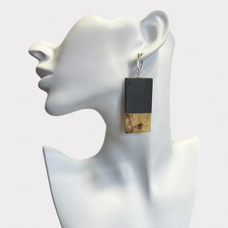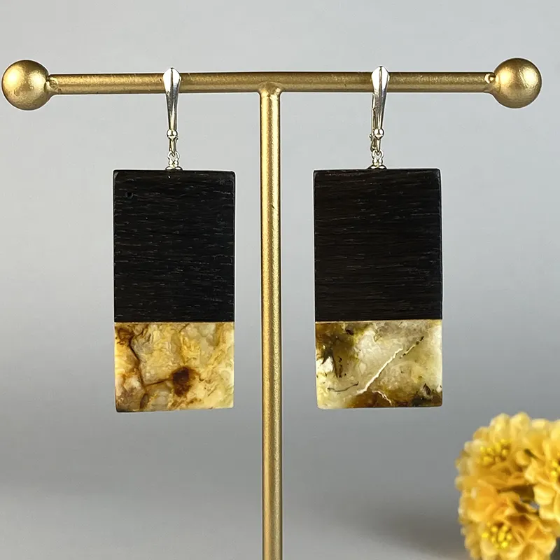 Elegantiški pailgų formų juodojo ąžuolo ir gelsvo margo gintaro auskarai. Šie gintariniai auskarai išskirtinai sukurti stilingai ir madingai moteriai.