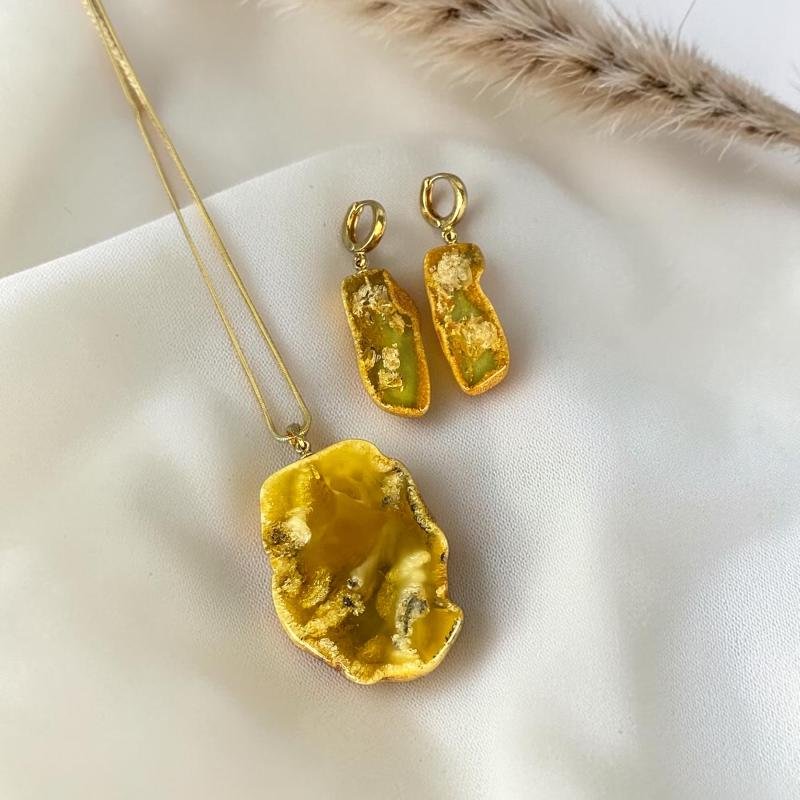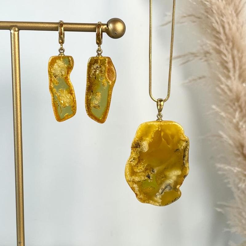 Įspūdingas gelsvo gintaro su natūralia žievele gintaro rinkinys. Šis gintarinis rinkinys išskirtinai sukurti stilingai ir madingai moteriai.