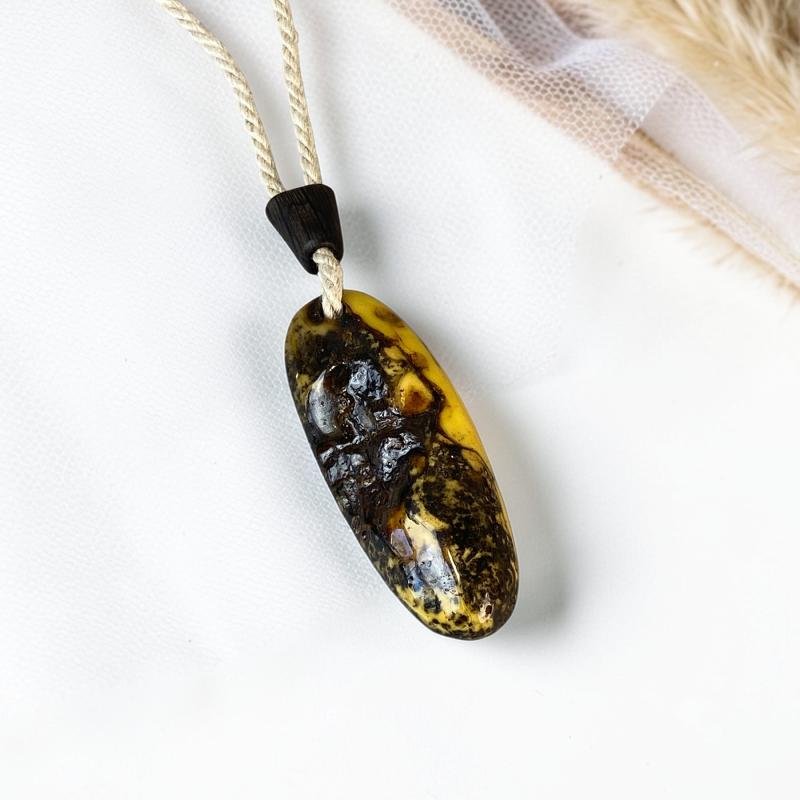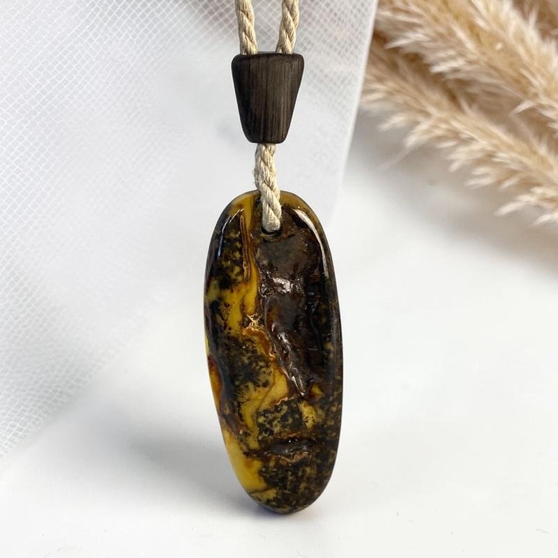 Įspūdingas pailgos formos margo gintaro kaklo pakabukas ant lininės virvelės. Šis gintarinis kaklo pakabukas gali būti puiki jūsų įvaizdžio detalė.