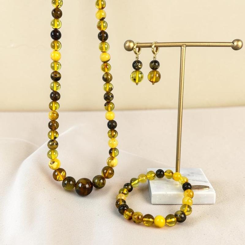 Išskirtinis ir prabangus įvairių spalvų gintaro rinkinys. Su šiuo išskirtiniu rinkiniu jausitės nuostabiai ir subtiliai.