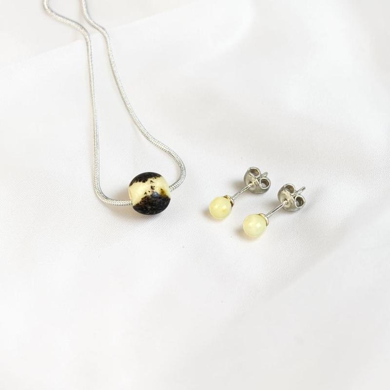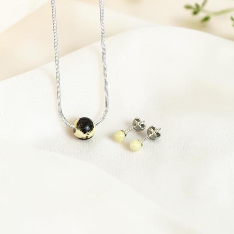Minimalistinis ir stilingas gintarinis rinkinys „Svajos“ – subtili elegancija vertinančioms natūralumą. Šį rinkinį sudaro unikalus gintaro rutuliuko pakabukas su „putpelinio“ rašto akcentais. Tai lengvas, romantiškas ir laikui nepavaldus papuošalų komplektas, kuris suteiks jūsų kasdieniam įvaizdžiui švelnaus spindesio ir Baltijos jūros ramybės.