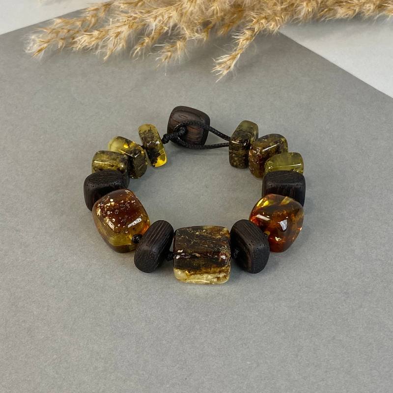 Moderni juodojo ąžuolo ir margo gintaro apyrankė. Ši apyrankė puikiai pagyvins jusų stiliaus ir aprangos pasirinkimą.