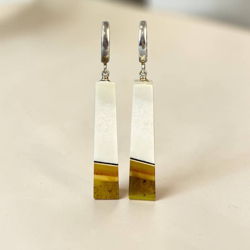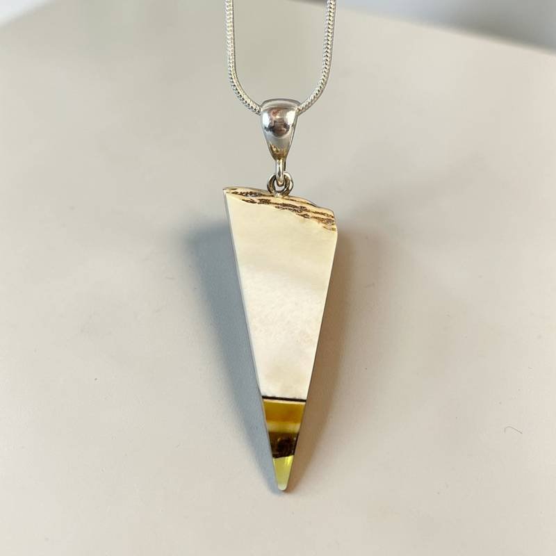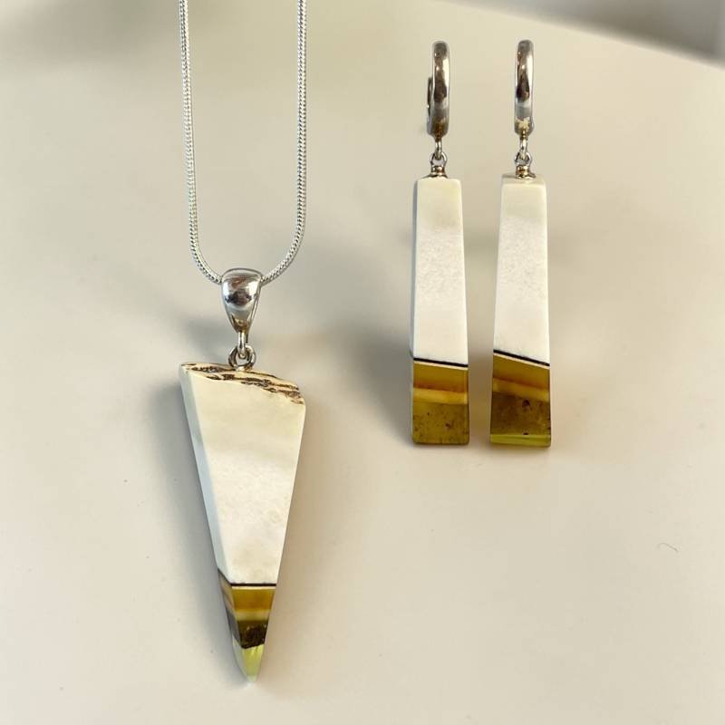 Modernus briedžio rago ir gelsvo gintaro auskarų ir pakabuko rinkinys. Šis gintarinis rinkinys išskirtinai sukurti stilingai ir madingai moteriai.