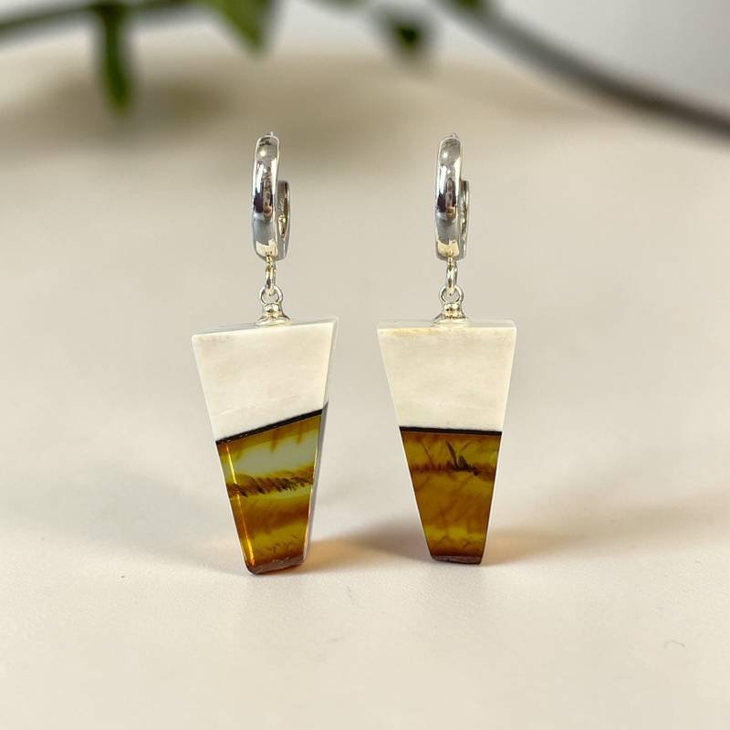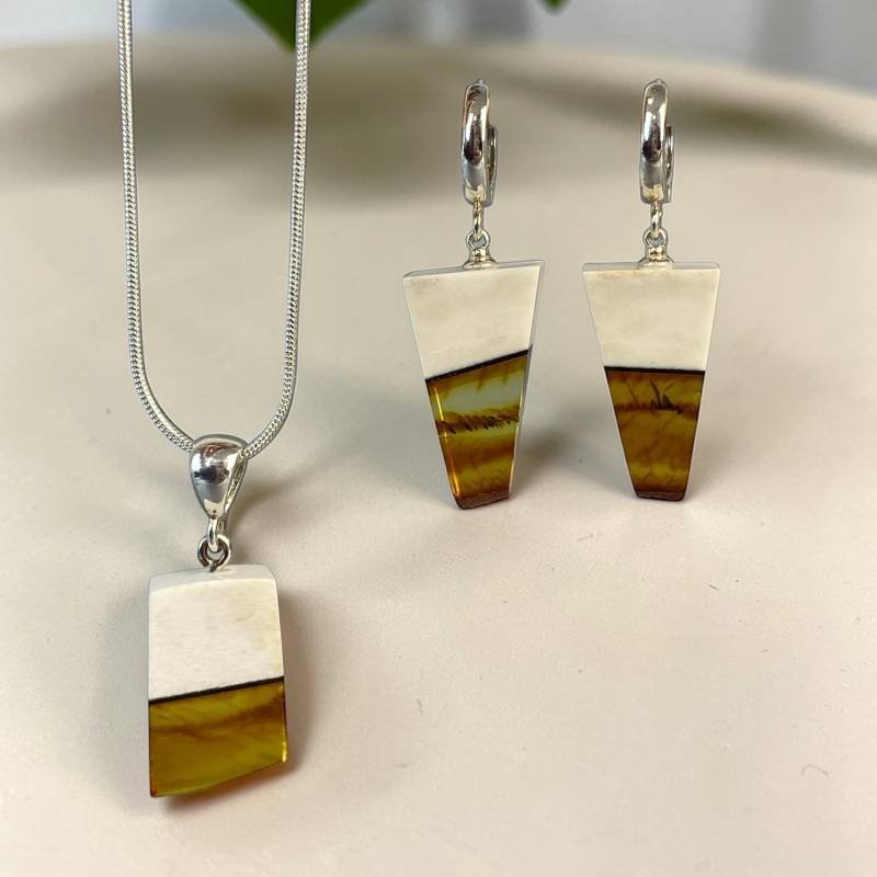 Modernus briedžio rago ir skaidraus medaus gintaro auskarų ir pakabuko rinkinys. Šis gintarinis rinkinys išskirtinai sukurti stilingai ir madingai moteriai.