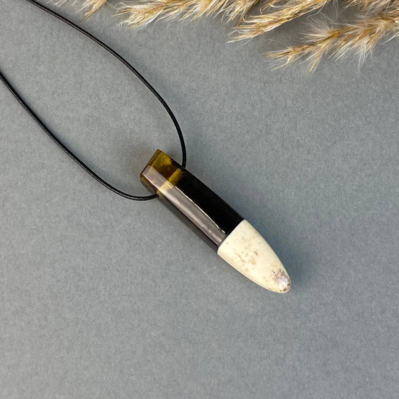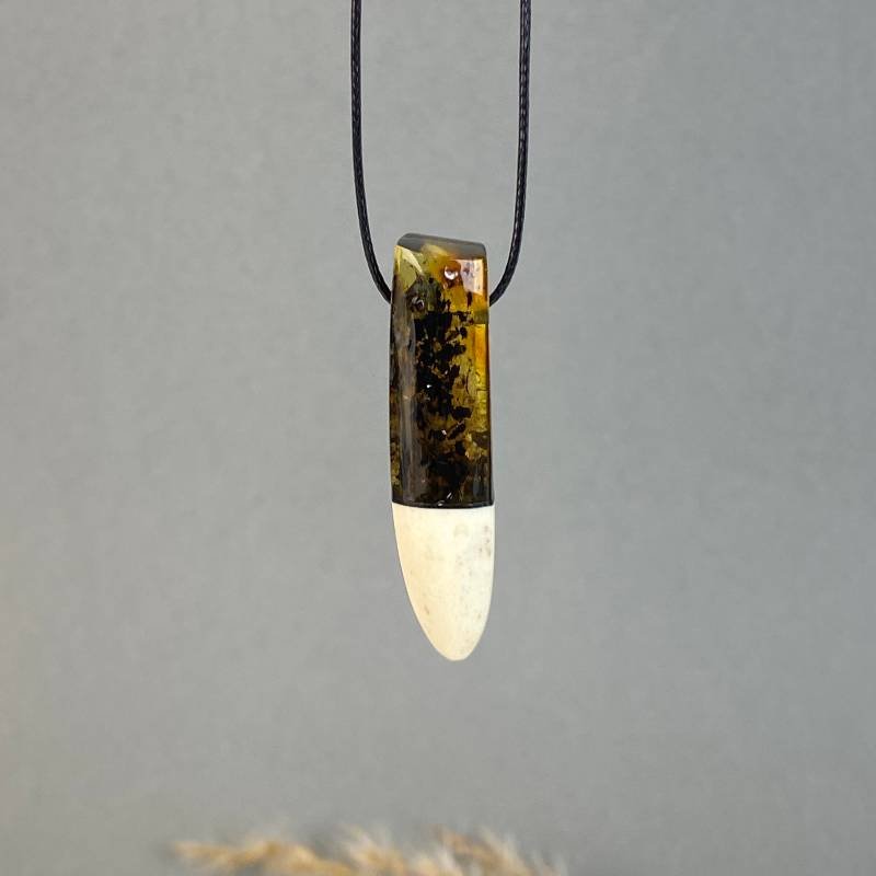 Modernus elnio rago ir skaidraus gintaro su tamsiomis samanėlėmis vyriškas kaklo pakabukas ant reguliuojamo ilgio virvelės.