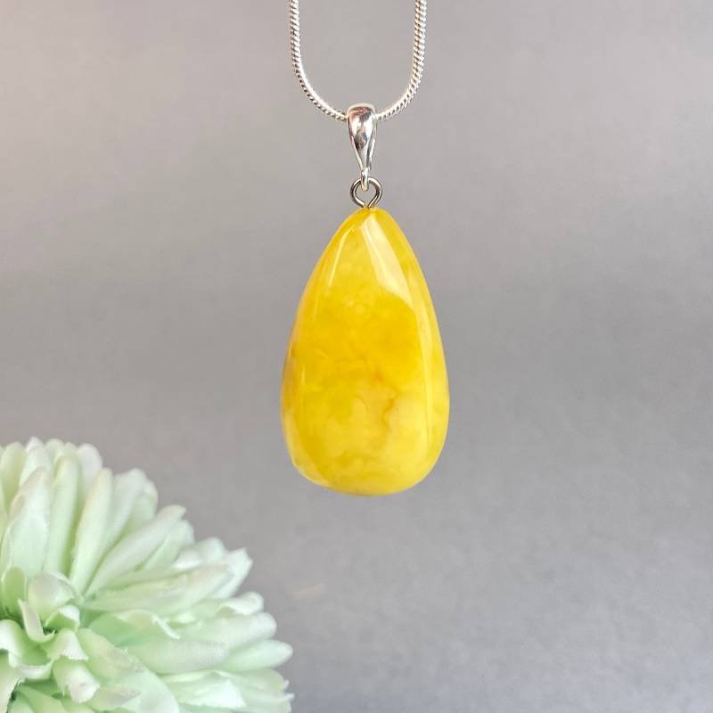 Modernus geltonos spalvos gintaro kaklo pakabukas. Šis gintarinis kaklo papuošalas gali būti puikia jūsų įvaizdžio detalė.