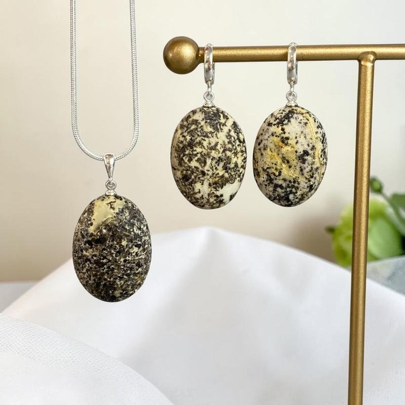 Išskirtinio dizaino Baltijos gintaro rinkinys, sujungiantis gamtos unikalumą ir modernią eleganciją. Šis „putpelinis“ gintaras pasižymi unikaliais raštais, kurių neįmanoma atkartoti, todėl būsite tikri, kad dėvite vienetinius papuošalus.