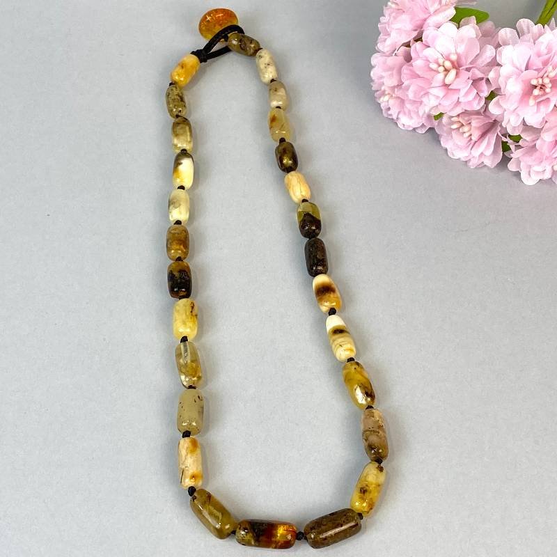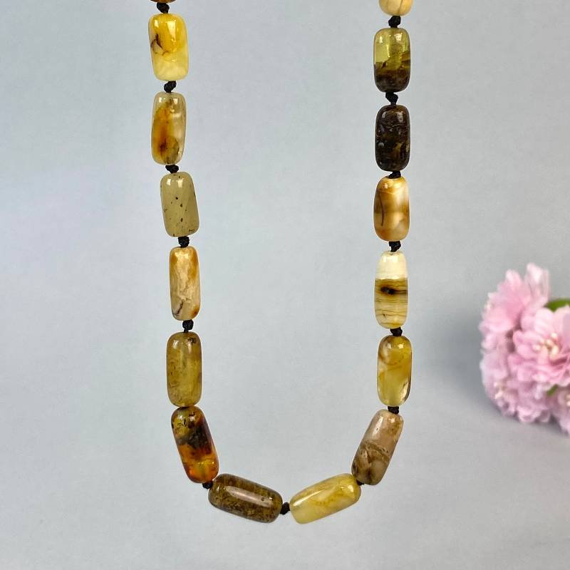 Modernus ir stilingas statinaičių formos margo gintaro vėrinys. Šis gintarinis kaklo vėrinys gali būti puiki jūsų įvaizdžio detalė.