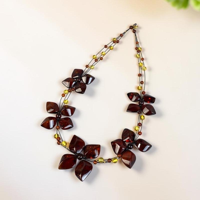 Prabangi žiedlapio formos vyšnios spalvos gintarinė koljė. Šis nuotabus papuošalas puikiai pagyvins visą jūsų įvaizdį.