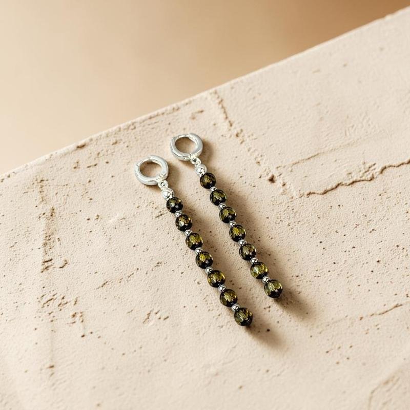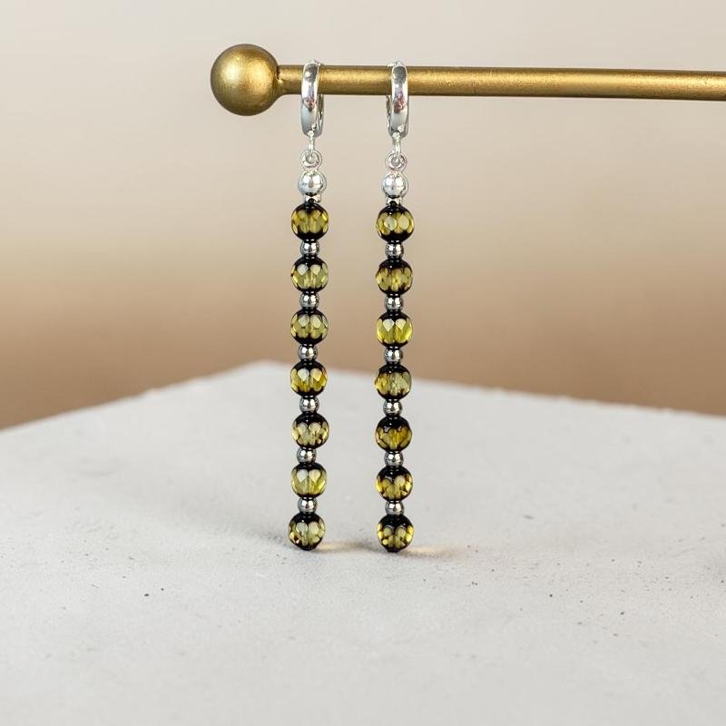 Stilingi ir prabangūs žalsvi facetuoti gintariniai auskarai. Šie gintariniai auskarai išskirtinai sukurti stilingai ir madingai moteriai.
