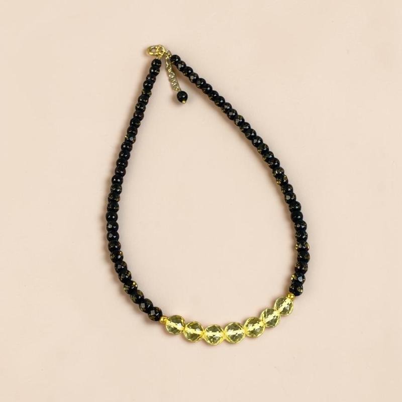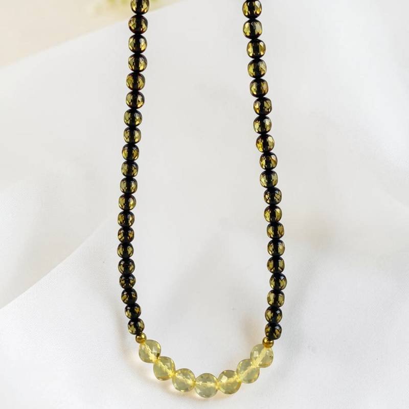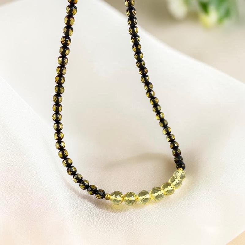 Prabangus žalsvo ir skaidriai geltono faetuoto gintarro vėrinys. Tai autentiškas, gamtos jėgą ir šiuolaikinę estetiką jungiantis aksesuaras.