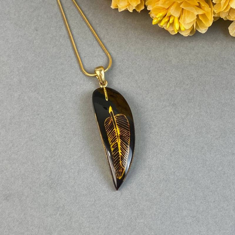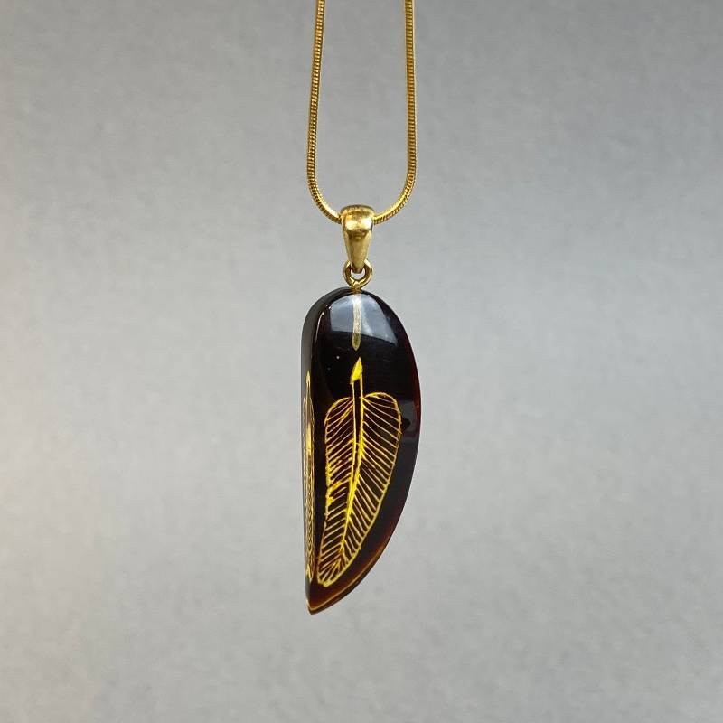 Skaidraus graviruoto gintaro kaklo pakabukas – plunksna. Šis gintarinis kaklo papuošalas gali būti puikia jūsų įvaizdžio detalė.