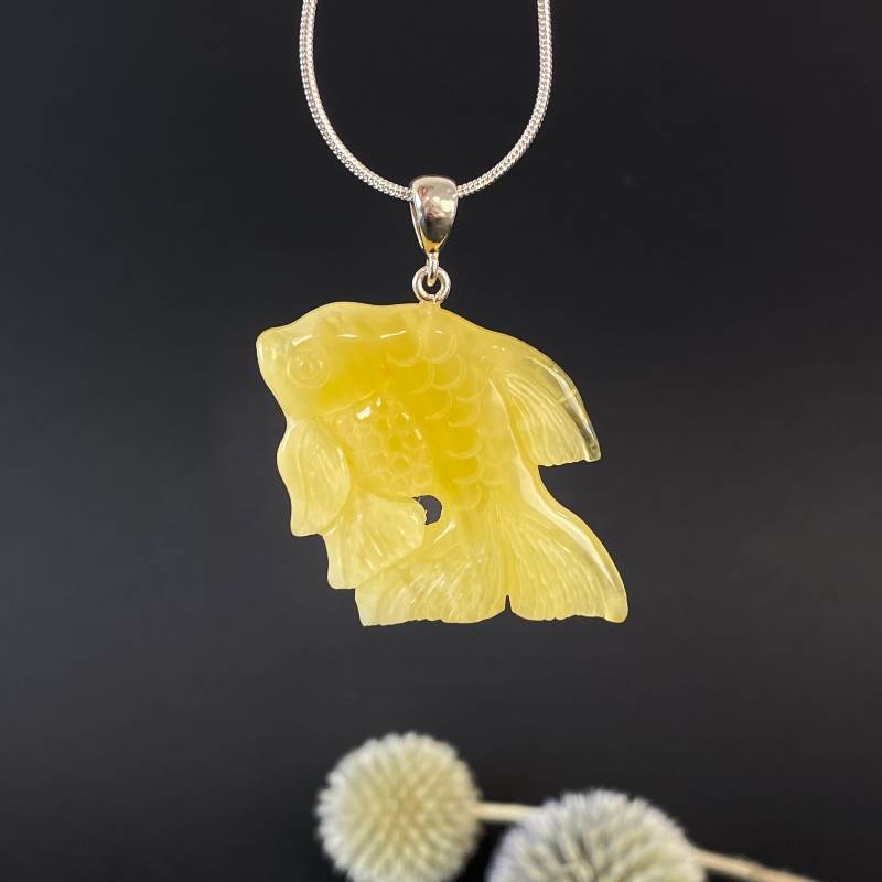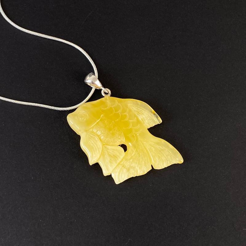 Stilinga ir moderni peizažinio gintaro pakabukas žuvelė. Šis gintarinis kaklo papuošalas gali būti puikia jūsų įvaizdžio detalė.