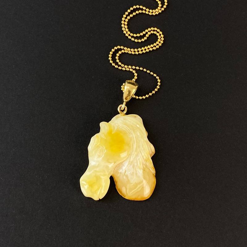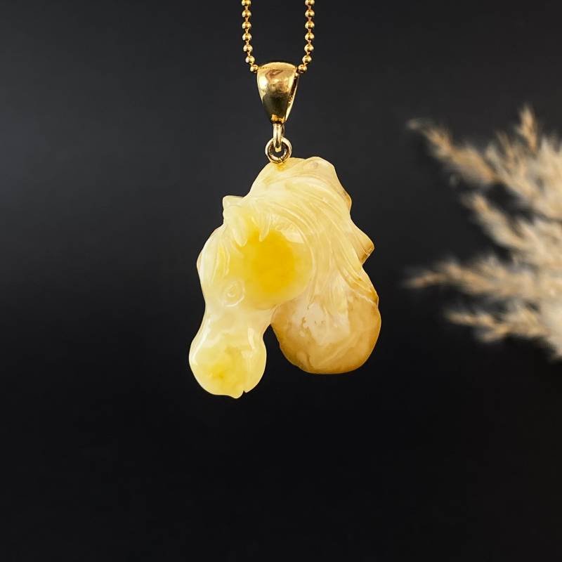 Stilingas graviruoto peizažinio gintaro kaklo pakabukas ”Arkliukas”. Šis gintarinis kaklo papuošalas gali būti puikia jūsų įvaizdžio detalė.