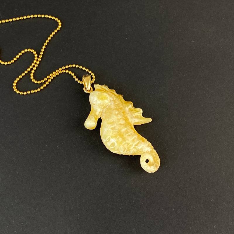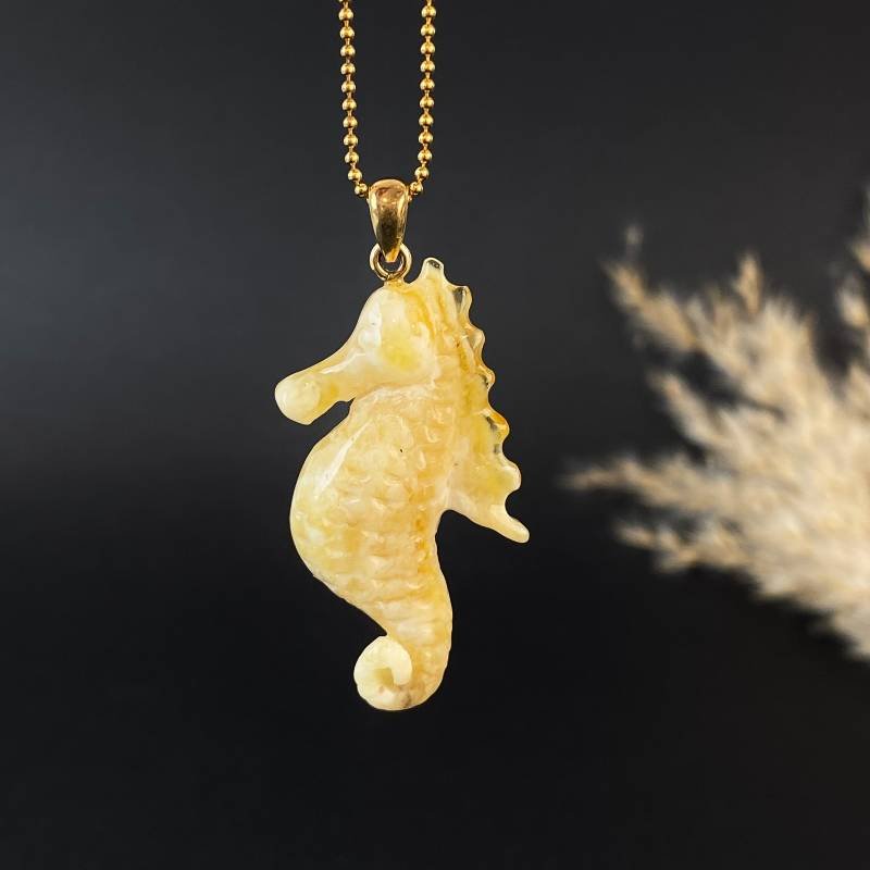 Stilingas graviruoto peizažinio gintaro kaklo pakabukas „Jūros arkliukas”. Šis gintarinis kaklo papuošalas gali būti puikia jūsų įvaizdžio detalė.
