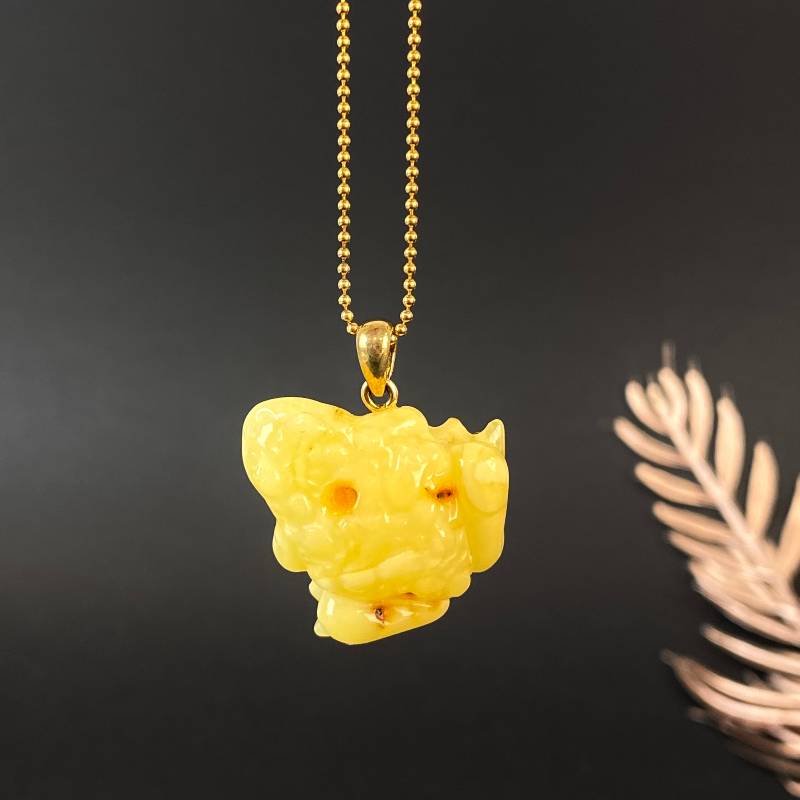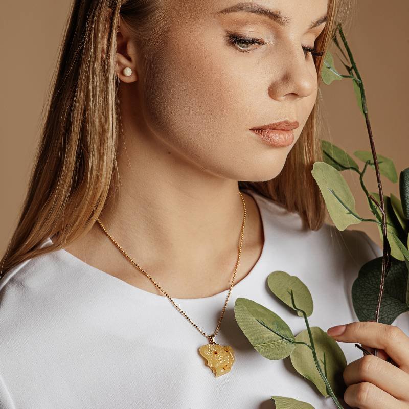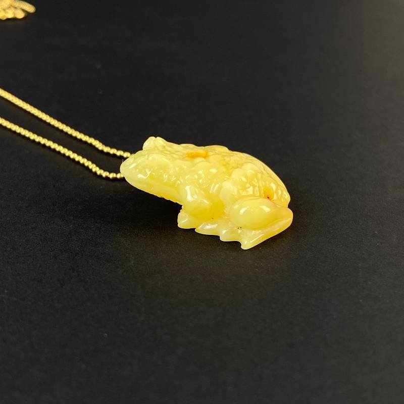 Stilingas graviruoto peizažinio gintaro kaklo pakabukas „Laimės varlytė”. Šis gintarinis kaklo papuošalas gali būti puikia jūsų įvaizdžio detalė.