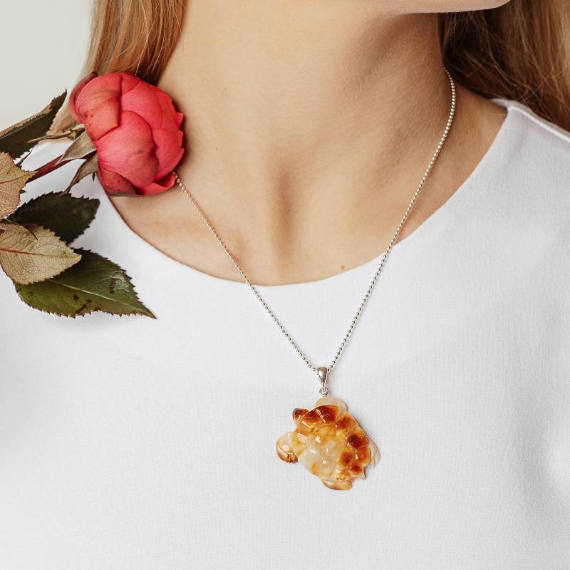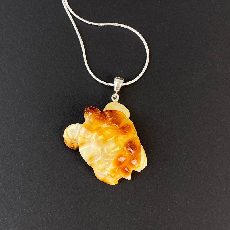 Stilingas graviruoto peizažinio gintaro kaklo pakabukas „Vėžlys”. Šis gintarinis kaklo papuošalas gali būti puikia jūsų įvaizdžio detalė.