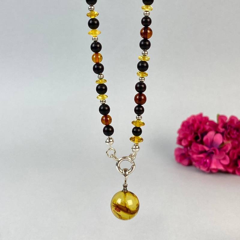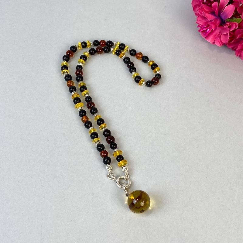 Stilingas ir minimalistinis įvairių spalvų gintaro vėrinys su pakabuku. Šis gintarinis kaklo vėrinys gali būti puiki jūsų įvaizdžio detalė.
