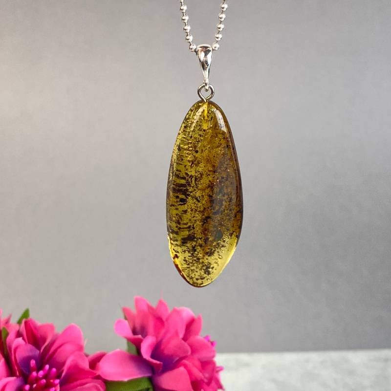 Stilingas ir subtilus samaninis gintaro kaklo pakabukas. Šis gintarinis kaklo papuošalas gali būti puikia jūsų įvaizdžio detalė.