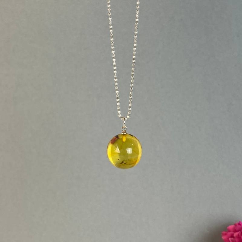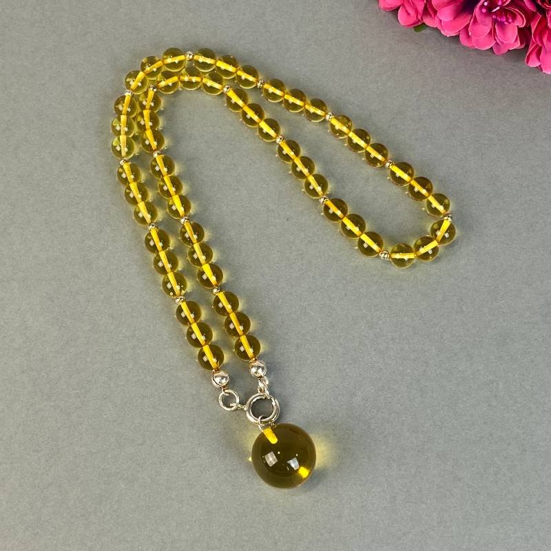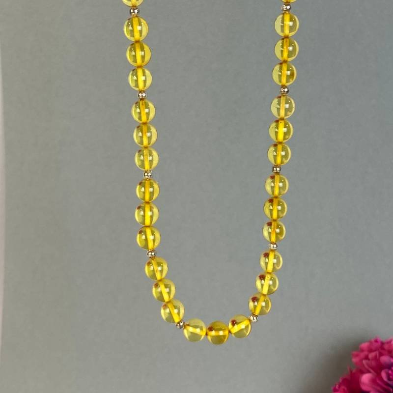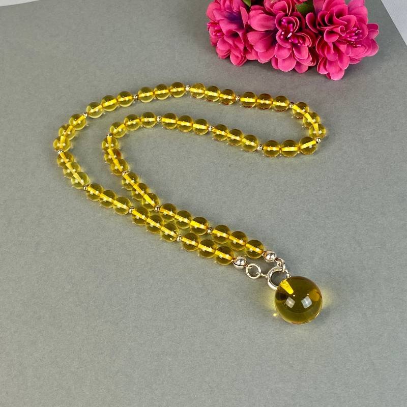 Stilingas skaidriai blizgaus gintaro karoliukų kaklo vėrinys su blizgiu pakabuku. Šis gintarinis kaklo vėrinys gali būti puiki jūsų įvaizdžio detalė.