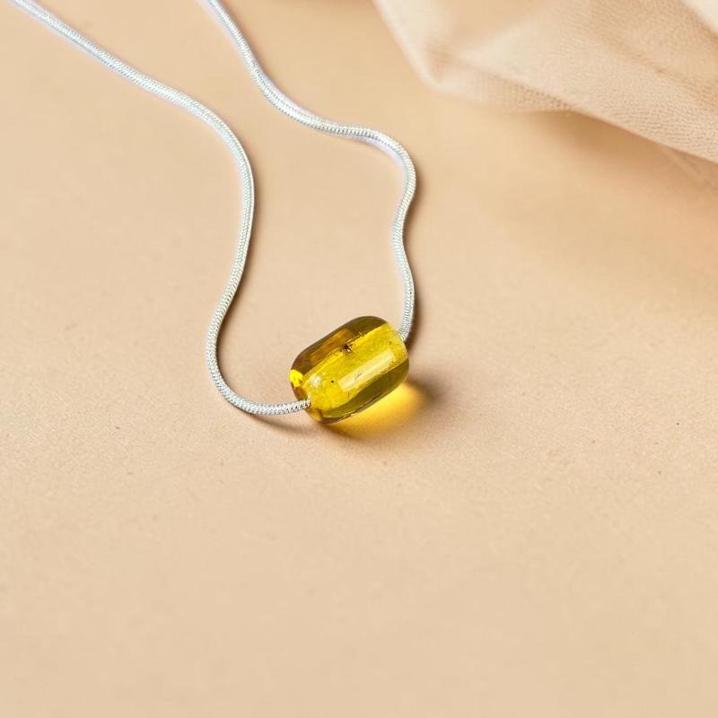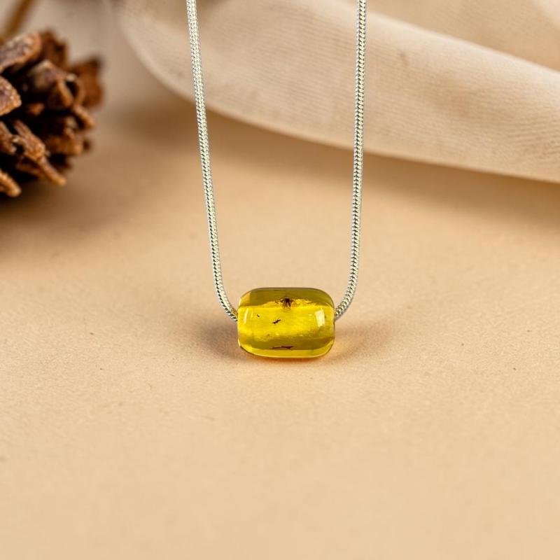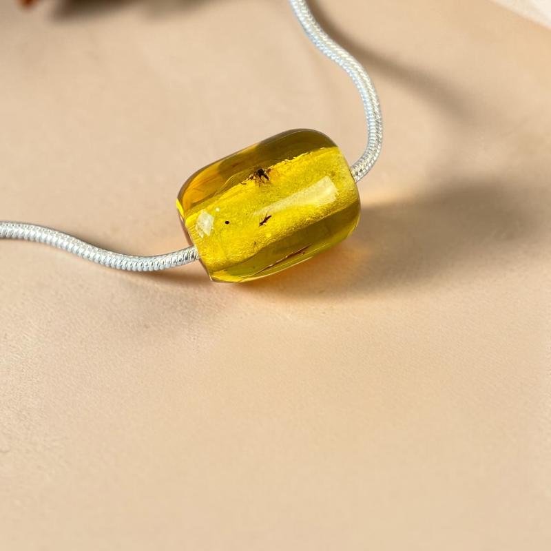 Stilingas skaidriai geltono su dviem muselės inkliuzais gintaro pakabukas. Pajuskite raminančią Baltijos jūros energiją su šiuo unikaliu, gintaro pakabuku. Tai modernus papuošalas, kuriame meistriškai atskleidžiamas natūralus gintaro grožis ir įvairovė.
