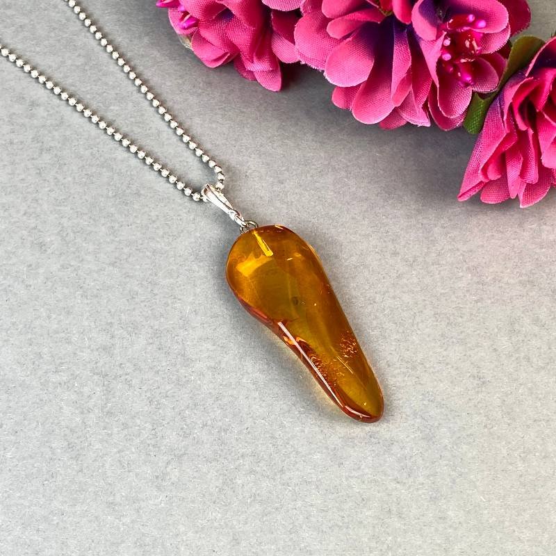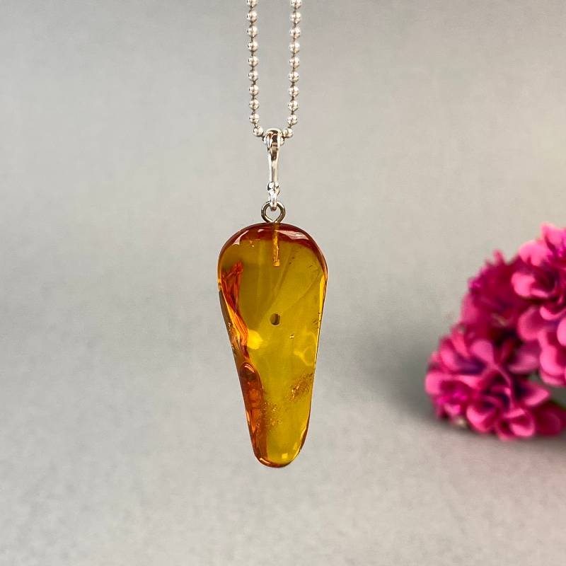 Stilingas skaidrios medaus spalvos gintaro kaklo pakabukas. Šis gintarinis kaklo papuošalas gali būti puikia jūsų įvaizdžio detalė.
