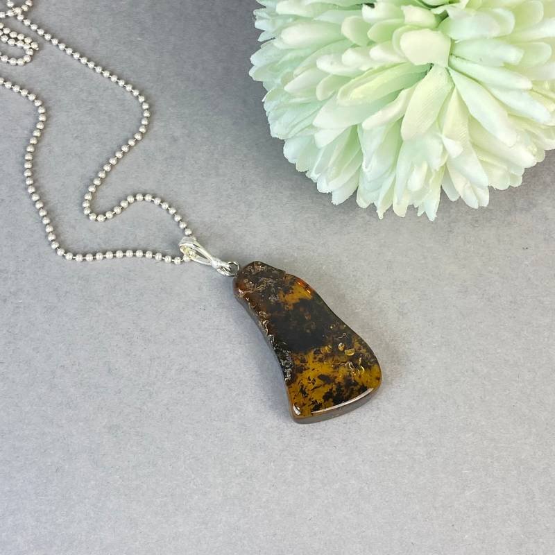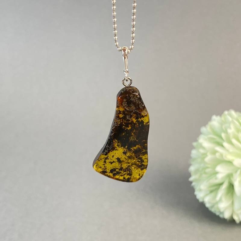 Stilingas skaidrios spalvos su samanėlėmis gintaro kaklo pakabukas. Šis gintarinis kaklo papuošalas gali būti puikia jūsų įvaizdžio detalė.